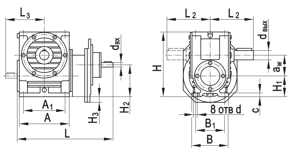Типоразмер аW A A1 B B1 L* L1max L2* L3* H H1 H2 H2 c d dвх dвых